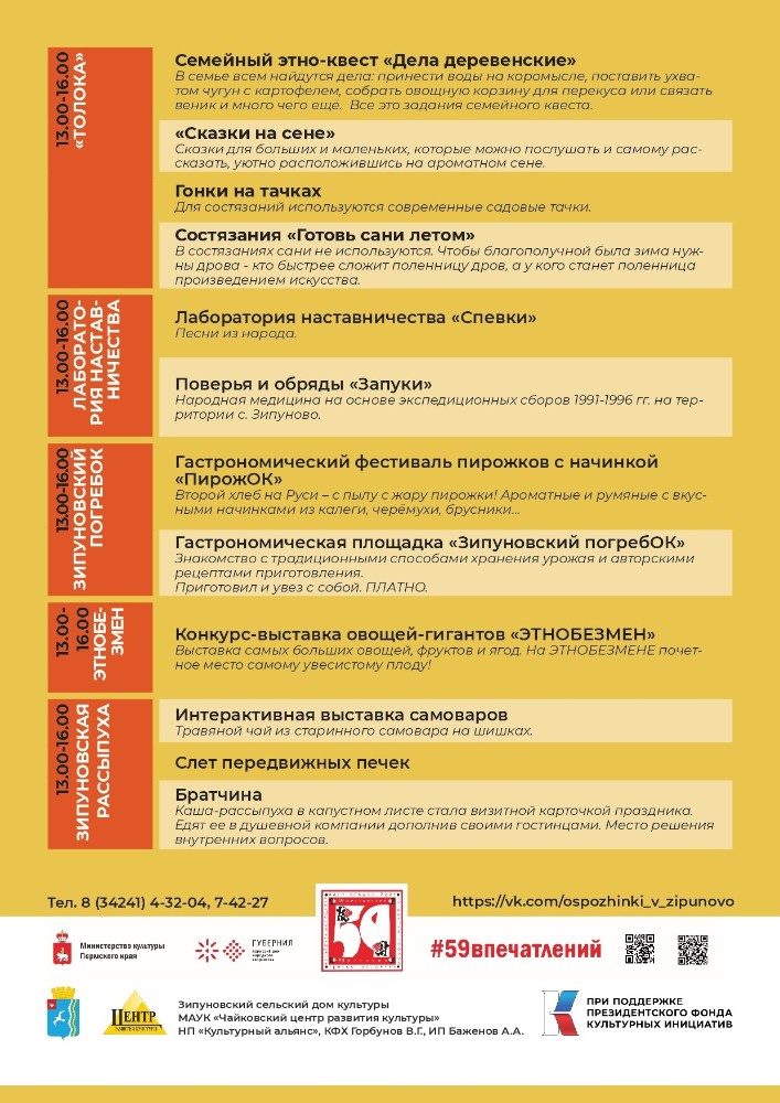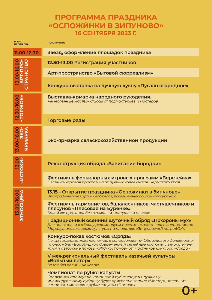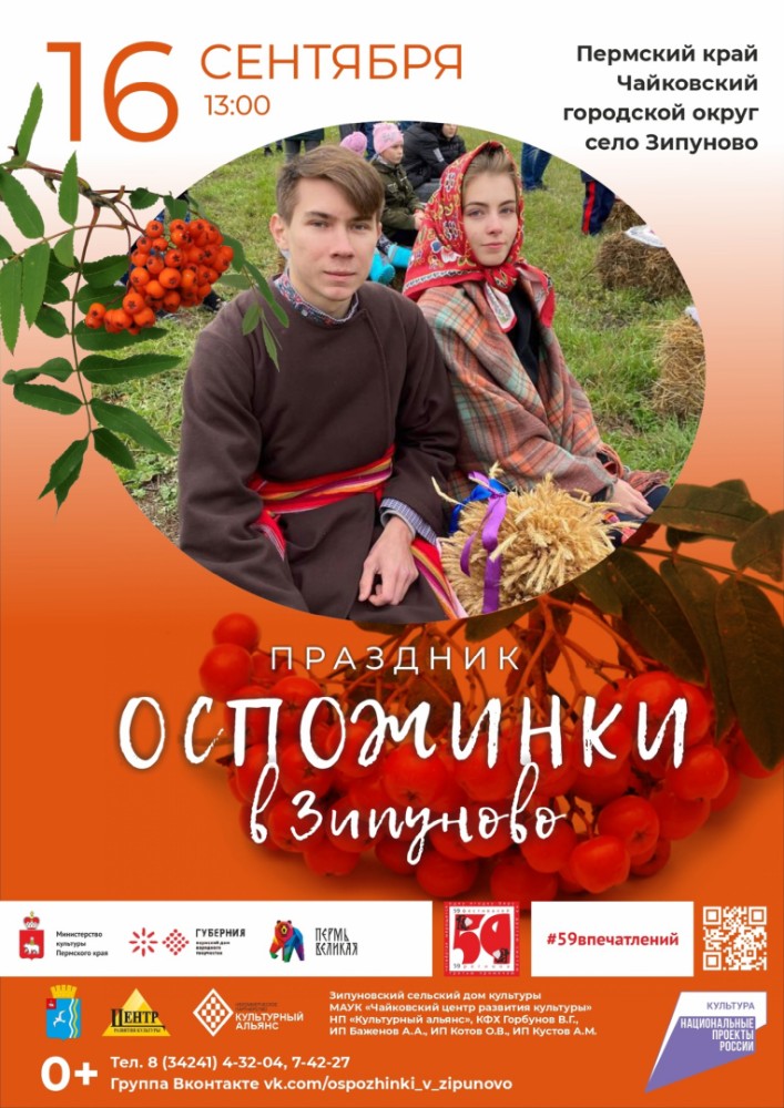 В субботу, 16 сентября, в селе Зипуново пройдёт народный, самобытный, колоритный фестиваль «Оспожинки» (0+). Программа праздника урожая очень насыщена и наполнена русским культурным кодом. Организаторами продумано много разноплановых площадок, поэтому каждый сможет найти себе что-то по душе, а воспоминания о нём будут греть всю долгую уральскую осень и зиму.