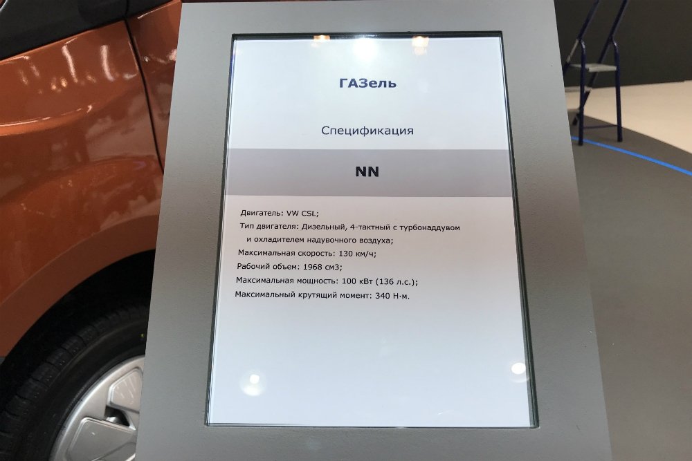 Что касается двигателя, то новая «Газель» получила дизельный VW CSL рабочим объёмом 1968 см3. Максимальная мощность мотора 136 л.с. (340 Нм), а скорость автомобиля ограничена отметкой 130 км/ч. Будут ли другие силовые агрегаты в линейке модели - не сообщается.