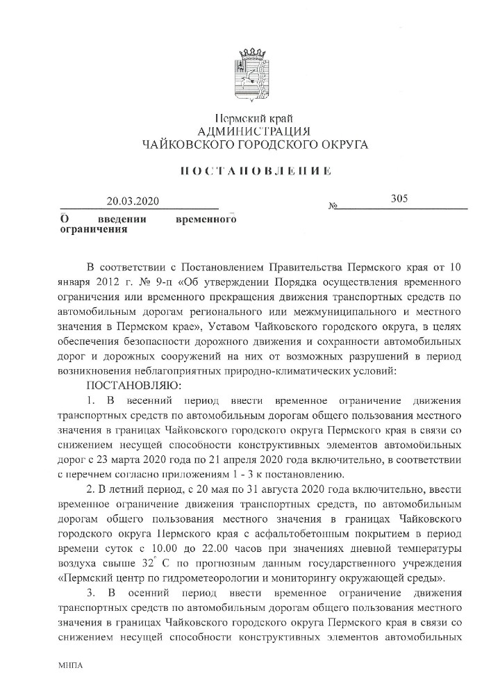 Соответствующее постановление о введении временных сезонных ограничениях было подписано главой Чайковского городского округа Юрием Востриковым. Публикуем документ полностью.