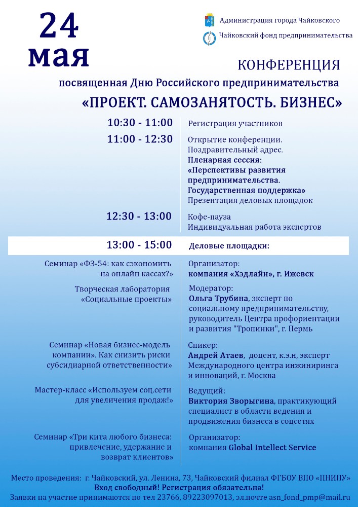 Чайковских предпринимателей приглашают на конференцию «Проект. Самозанятость. Бизнес», которая приурочена ко Дню российского предпринимательства и пройдёт в пятницу, 24 мая.