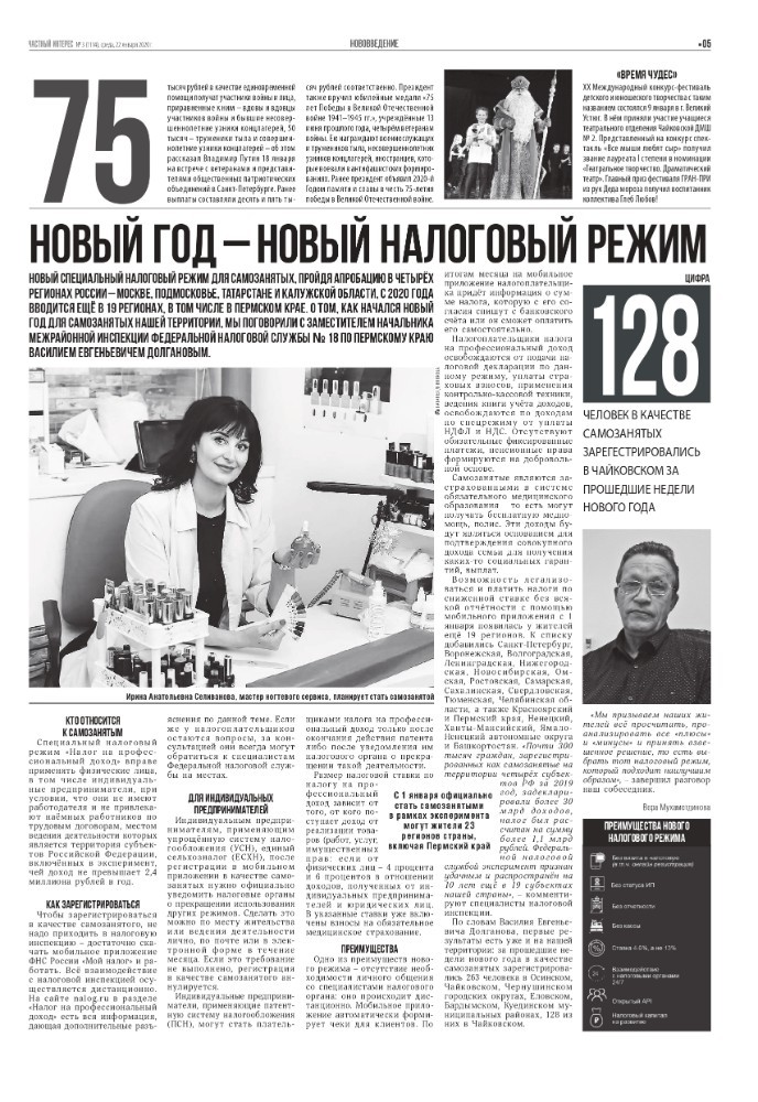 Отметим, что в выпуске №3(1114) от 22 января еженедельника «Частный интерес» опубликован материал о том, как начался новый год для самозанятых нашей территории. Корреспондент поговорила с заместителем начальника Межрайонной инспекции Федеральной налоговой службы № 18 по Пермскому краю Василием Евгеньевичем Долгановым.