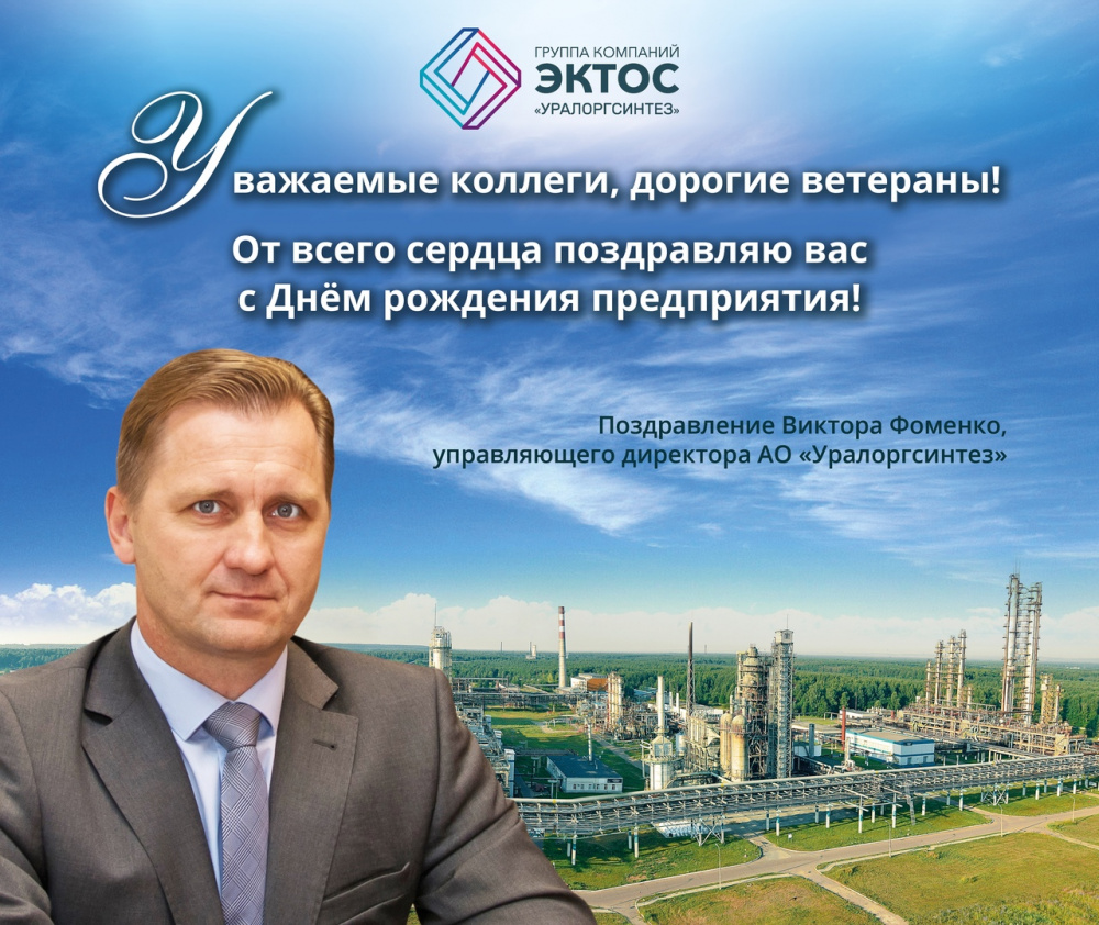 Хочу пожелать «Уралоргсинтезу» совместно с Группой компаний «ЭКТОС» преодолеть вызовы этого нелёгкого времени. А Вам и Вашим семьям прежде всего крепкого здоровья, благополучия и множества ярких и интересных событий в будущем!