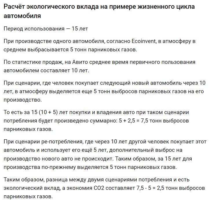 В пресс-службе Авито также продемонстрировали расчёт экологического вклада на примере жизненного цикла автомобиля, продаваемого на вторичном рынке: