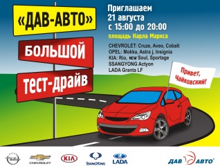 21 августа в нашем городе пройдет тест-драйв автомобилей от компании «ДАВ-АВТО»! Изюминкой этого мероприятия станет возможность испытать на тест-драйве автомобили сразу нескольких марок: КIA, LADA, Chevrolet, SsangYong и Оpel.