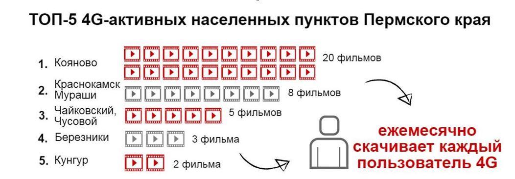 Согласно данным МТС, город вошел в топ-пять самых активных населенных пунктов Пермского края по объему интернет-трафика и занял третье место, опередив Кунгур и Березники. В среднем каждый пользователь 4G от МТС в Чайковском ежемесячно скачивает порядка 7 Гб информации, этот объем можно сравнить с пятью полнометражными фильмами.
