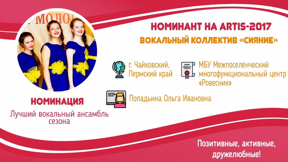 Кроме того, в номинации «Лучший вокальный ансамбль сезона» за победу поборется и вокальный коллектив «Сияние». Стоит отметить, что «Сияние» дебютирует в данном конкурсе. Коллективу 7 лет, за эти годы талантливые вокалисты неоднократно становились победителями международных конкурсов. Большой опыт выступлений поможет им отлично показать себя и свои творческие номера. Активные и жизнерадостные артисты надеются на справедливый результат и планируют получить массу новых положительных впечатлений.