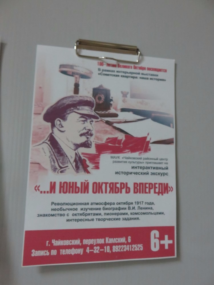 МАУК «Чайковском районном центре развития культуры» приглашает всех желающих посетить интерьерную выставку «Советская квартира: наша история» и принять участие в интерактивном историческом экскурсе, посвящённом 100–летию Октябрьской революции.