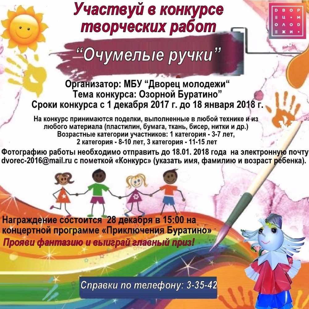 На конкурс принимаются творческие работы – поделки, выполненные в любой технике и из любого материала (пластилин, бумага, ткань, бисер, нитки и др.). Тема конкурса - Озорной Буратино. Участвовать в конкурсе поделок могут дети от 3 до 15 лет. Творческое состязание продлится до 18 января 2018 года.