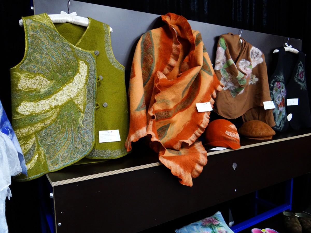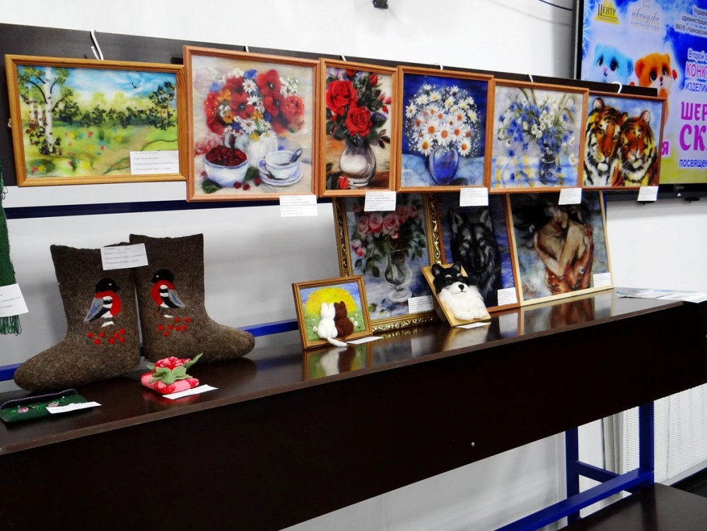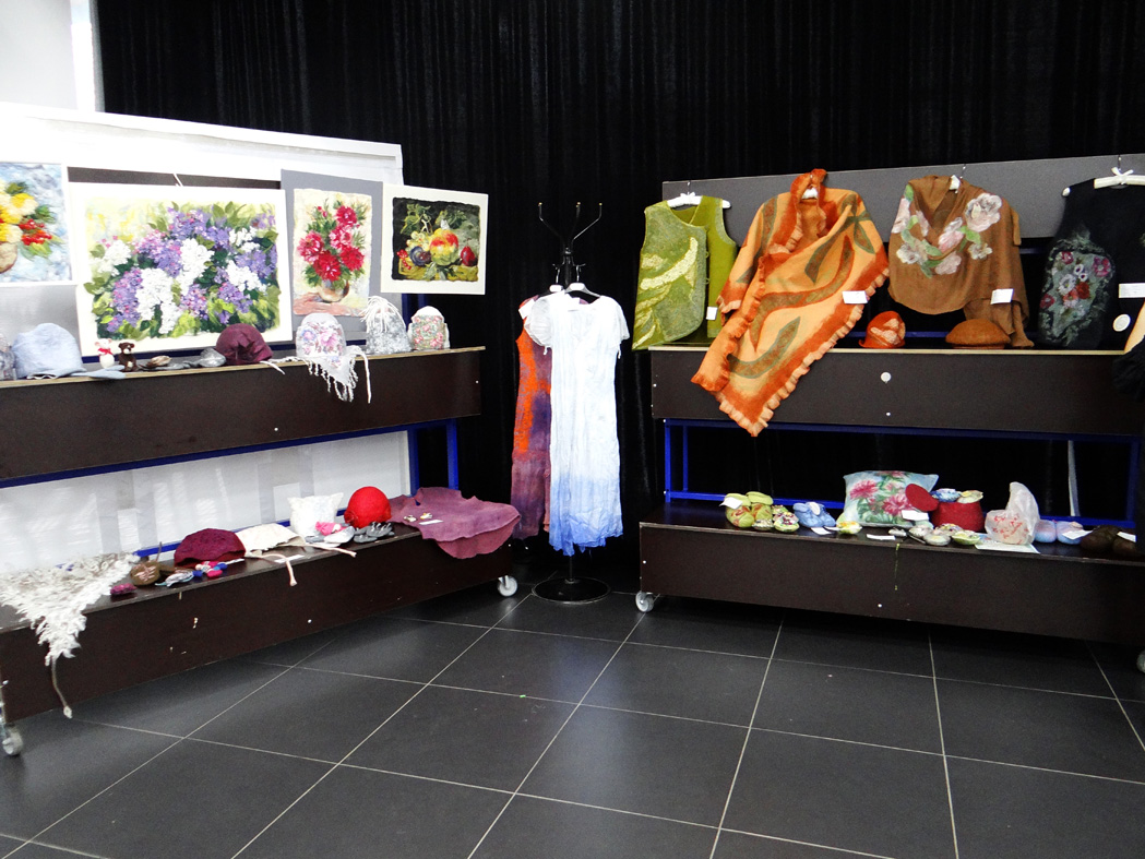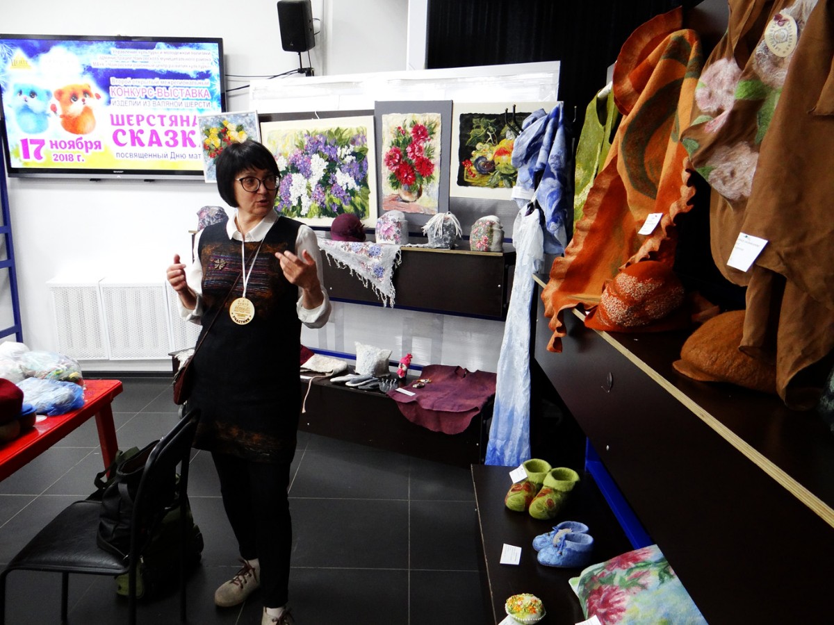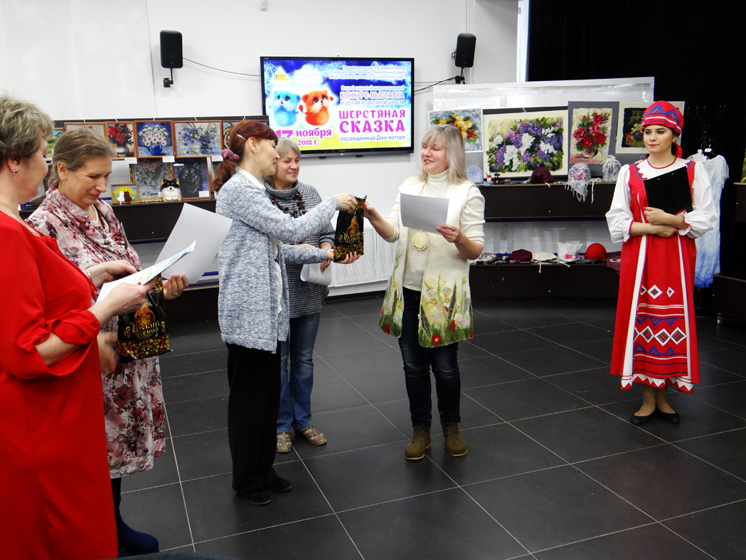 Затем состоялось знакомство с конкурсантами в творческих презентациях авторских композиций выставки. Участники представили свои готовые работы, рассказали об увлечении одним из самых нелёгких видов декоративно-прикладного творчества – валянии. Тема выставки-2018 называлась «Подарок самой доброй и родной», поэтому конкурсная экспозиция была представлена очень изысканными, но уютными вещами. Тончайшие платья и палантины, модные шляпки, береты и шапочки, рукавички и мягкие домашние туфли, подушки-думки и изящные игольницы, сумочки, футляры для телефона и кошельки – всё это из валяной шерсти! Поразили своим великолепием картины из шерсти: натюрморты, пейзажи, анималистический жанр.