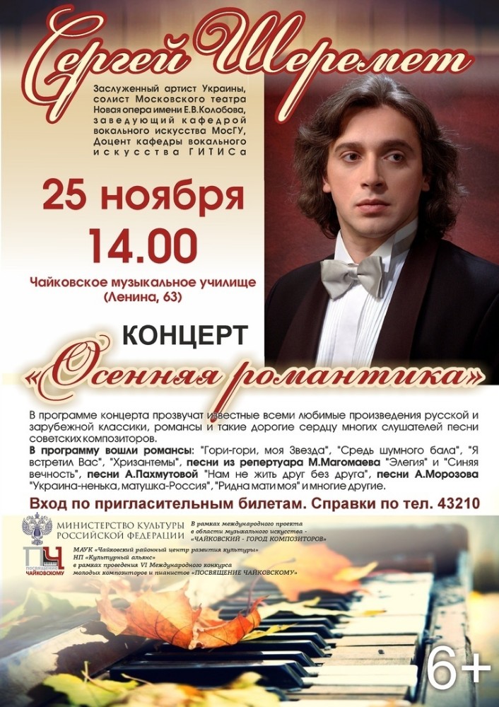 Завтра, 23 ноября, концертный зал Чайковского музыкального училища вновь дружелюбно распахнет двери для любителей и ценителей музыкального искусства. В этот вечер там пройдёт концерт «Звуки манящие, дивные, тайные...» с участием Натальи Осадчей (сопрано, лауреат международных конкурсов, г. Москва) и Виктории Стрижко (концертмейстер, дипломант международных конкурсов, г.Москва). В программе концерта произведения П.И. Чайковского, С.В. Рахманинова, Ф.Н. Надененко, В.С. Костенко.
