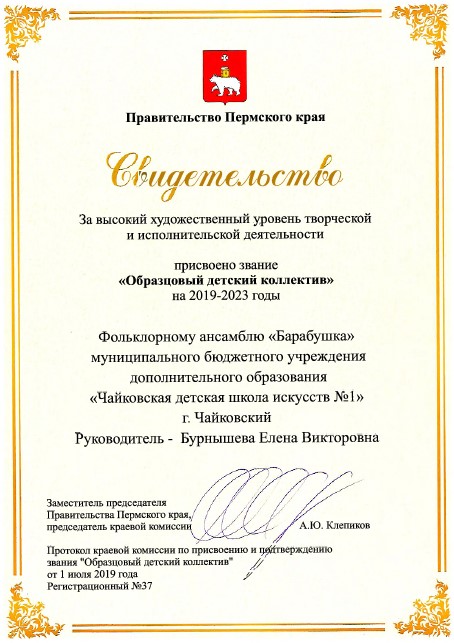 Долгожданную и заслуженную награду получил фольклорный ансамбль «Барабушка» Чайковской детской школы искусств №1. Отметим, уже не мало лет творческий коллектив занимается под руководством Бурнышевой Елены Викторовны.