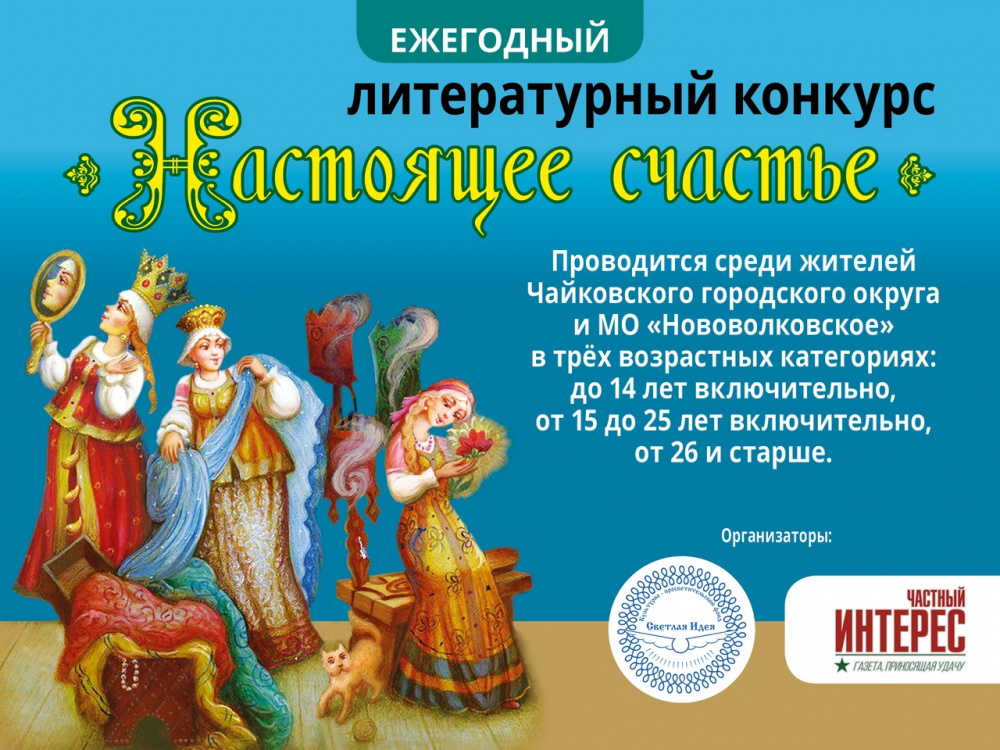 Ежегодный литературный конкурс «Настоящее счастье» проводится среди жителей Чайковского городского округа и МО «Нововолковское» в трёх возрастных категориях: 14 лет и младше, от 15 до 25 лет включительно, от 26 лет и старше. Участникам необходимо написать сочинение или эссе на тему «Настоящее счастье» в свободной форме (можно описать художественный образ либо собственные размышления, перечислить психологические закономерности, способствующие достижению полноценной радости и т.д.) – не менее двух и не более восьми страниц формата А4.