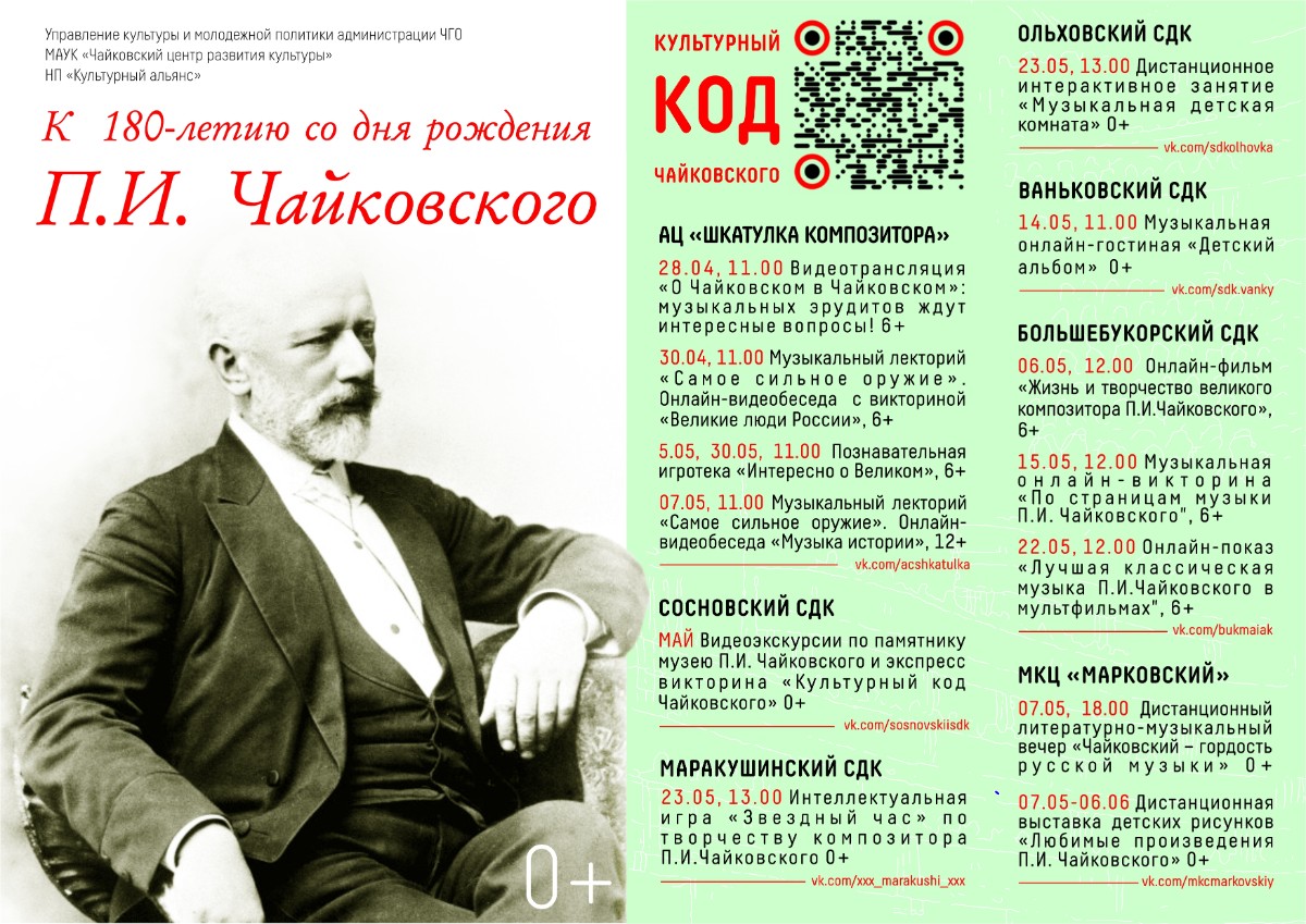 «Ни музыка, ни литература, ни какое бы то ни было искусство в настоящем смысле этого слова, не существуют для простой забавы; они отвечают гораздо более глубоким потребностям человеческого общества, нежели обыкновенной жажде развлечения и лёгких удовольствий» - так считал П.И.Чайковский. Поэтому Чайковский центр развития культуры приглашает всех почитателей таланта великого композитора и жителей округа провести время интересно и с пользой, посетив праздничные онлайн-события.