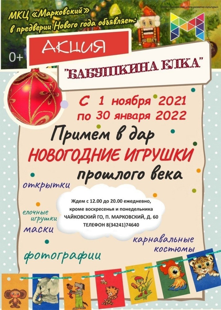 В Чайковском городском округе проходит акция «Бабушкина ёлка». Многофункциональный культурный центр «Марковский» принимает в дар новогодние атрибуты прошлого века: ёлочные игрушки, открытки, карнавальные костюмы, маски, фотографии и прочее. С подобными игрушками связаны самые трогательные новогодние воспоминания: это ёлка в доме бабушки и дедушки, стеклярусные бусы и маленькие фигурки для украшения искусственной ёлочки-малютки.