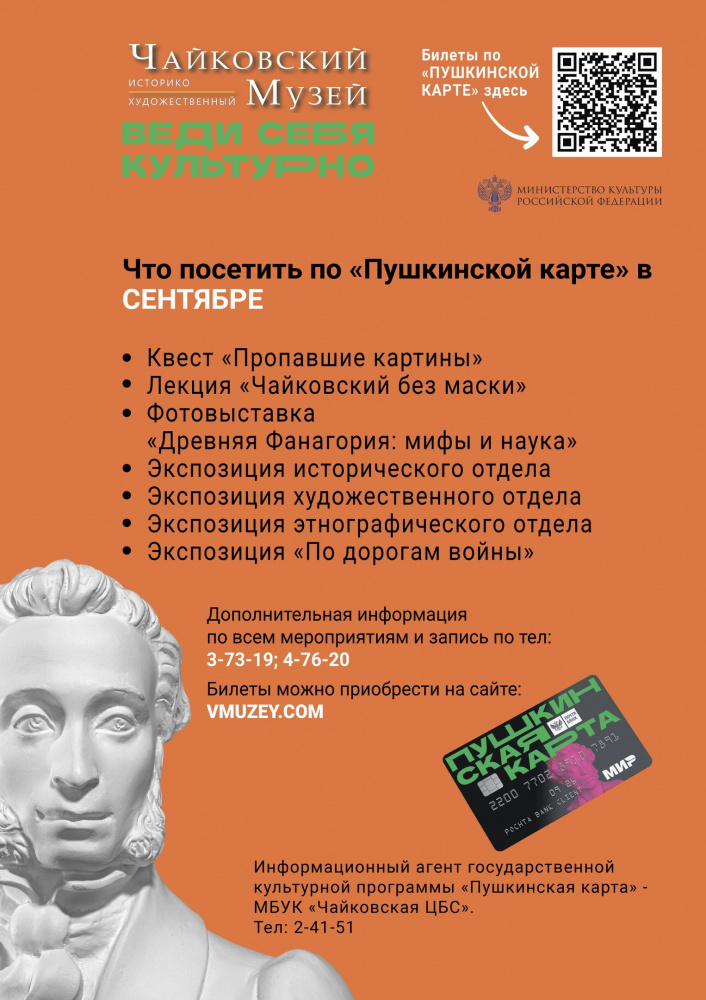 Чайковский историко-художественный музей предлагает молодым людям олатить «Пушкинской картой» входные билеты на следующие экспозиции и выставки:
