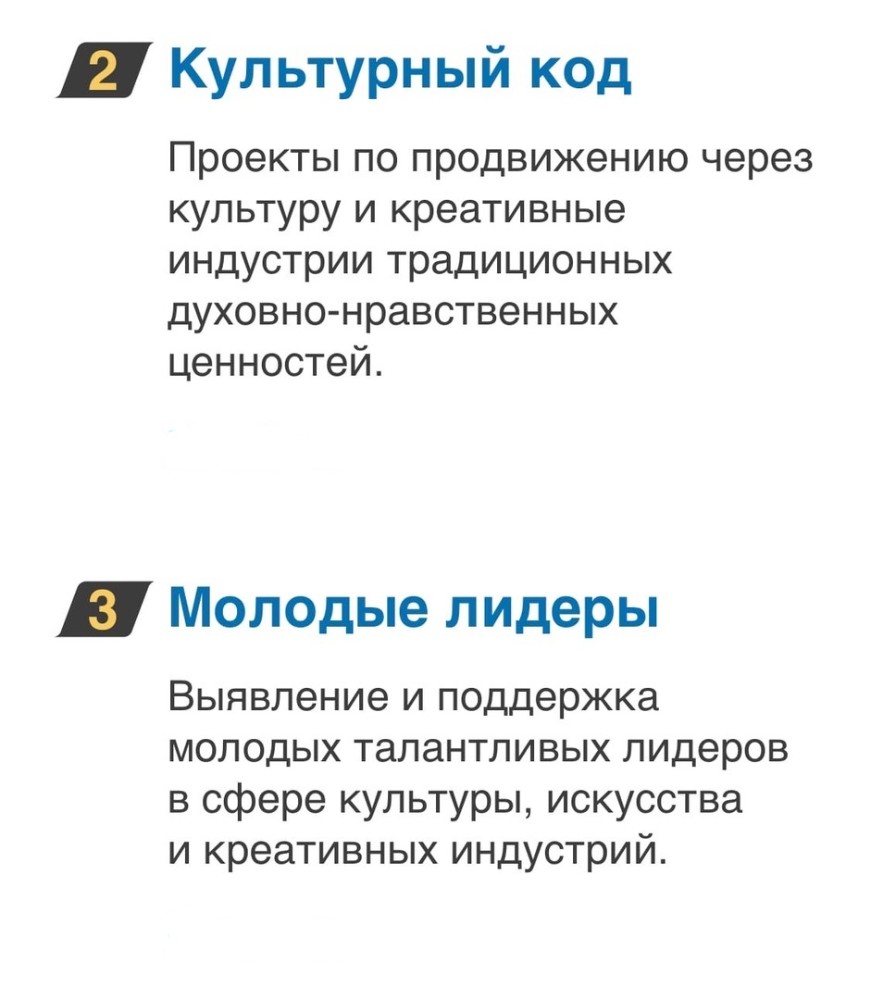 - проекты, предусматривающие проведение фестивалей, премий, форумов в области культуры, искусства и креативных индустрий; стартапы в области культуры, искусства и креативных индустрий; проекты в области современной популярной культуры.