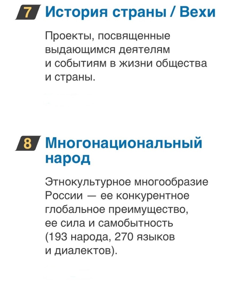 Проекты должны соответствовать следующим тематическим направлениям конкурса: «Нация созидателей», «Великое русское слово», «Я горжусь», «Место силы», «Культурный код», «Молодые лидеры», «История страны: история преодолений и побед. Вехи», «Многонациональный народ».