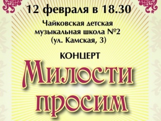 12 февраля в 18-30 часов, в Чайковской детской музыкальной школе №2 (ул. Камская, 3) состоится концерт, рассказывающий о гостеприимстве разных народов под названием «Милости просим».
