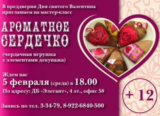 Девушек приглашают на мастер-класс "АРОМАТНОЕ СЕРДЕЧКО" по изготовлению чердачной игрушки с элементами декупажа. Чайковские мастерицы научатся делать игрушку и одновременно смогут изготовить уникальный подарок своим любимым своими руками.