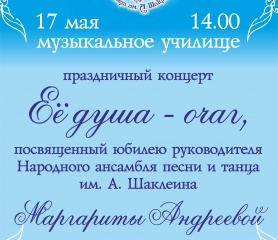 17 мая в Чайковском музыкальном училище состоится праздничный концерт "Её душа - очаг", посвященный юбилею руководителя Народного ансамбля песни и танца им. А.Шаклеина Маргариты Андреевой.