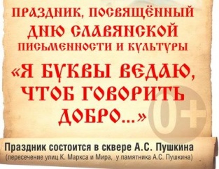 « Я буквы ведаю, чтоб говорить добро...» - так называется праздничная программа, которая пройдет 24 мая в 12 часов в сквере у памятника А.С.Пушкину. Она посвящена Дню славянской культуры, дню славянской письменности.