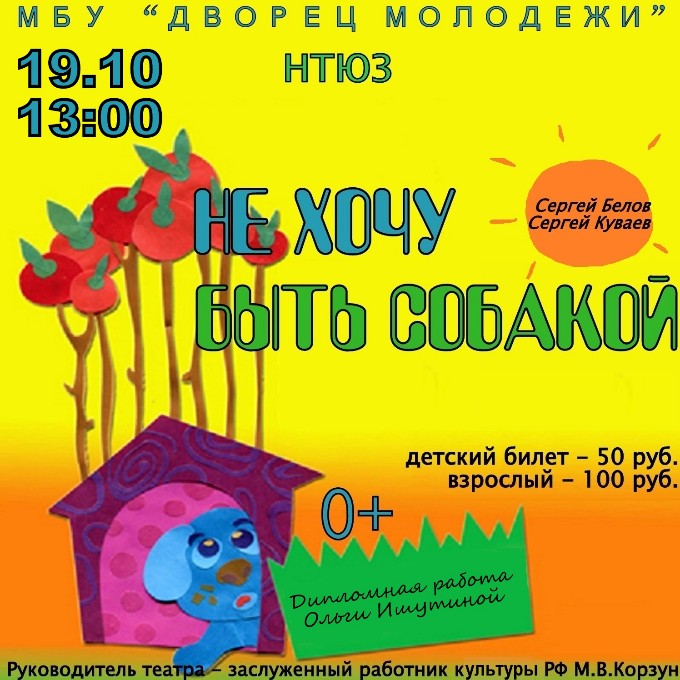 Народный Театр Юного Зрителя приглашает желающих всех возрастов на сказку «Не хочу быть собакой», которая пройдёт 19 октября в 13:00 во Дворце молодежи.