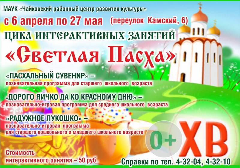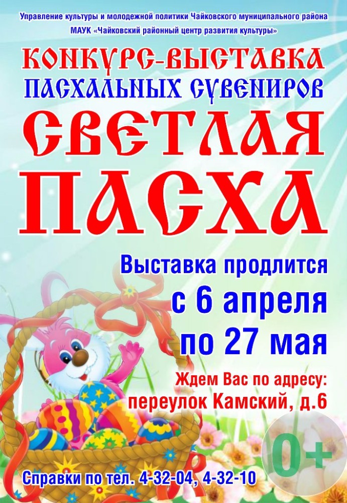 6 апреля в Чайковском состоялось открытие выставки народного творчества «Светлая Пасха». Организатор выставки – Чайковский районный центр развития культуры. Торжественное открытие выставки проходило накануне православного Благовещения.