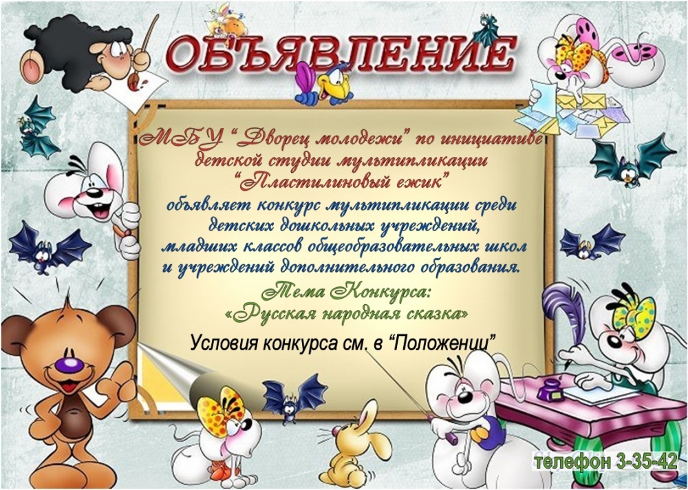 Коллектив авторов или отдельный автор должен предоставить до 11 мая свою работу – мультипликационный фильм. Тема конкурса: «Русская народная сказка». Организаторы конкурса подчёркивают, что работы принимаются только на электронном носителе (флеш-карте).