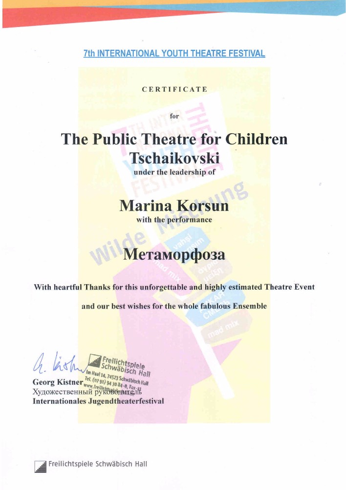 Коллектив чайковского НТЮЗа во главе с руководителем театра Мариной Корзун совсем недавно вернулись из немецкого города Швебиш-Халль. Стоит отметить, что старинный город славится своими фестивалями: фестиваль джазовой культуры, дни «Живой литературы», каждые два года проходит международный фестиваль любительских театров. В этом году состоялся уже седьмой по счёту. На фестивале коллективы не только показывают свои работы, но и получают новые навыки на мастер-классах.