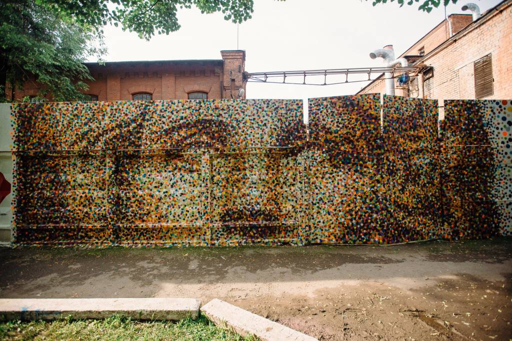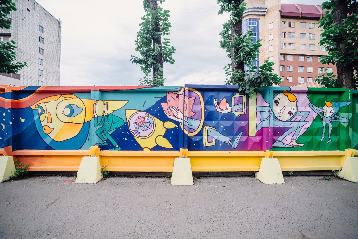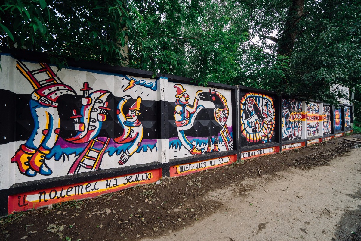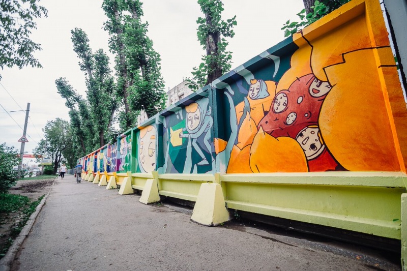 Фестиваль действительно вышел длинным. Готовить «холсты»-заборы - очищать от объявлений, покрывать грунтовкой - начали ещё 10 июня. Потом по эскизам художников волонтеры стали рисовать граффити. Но из-за обильных осадков работы затянулись. В результате последний забор докрашивали 28 июля.