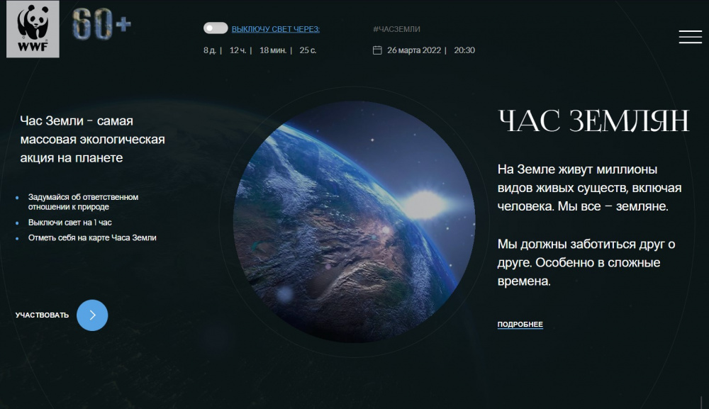 «В этом году мы не планируем никаких крупных мероприятий, но сама акция очень важна для нас и для многих россиян, поэтому она состоится. В 20:30 мы выключим свет у себя дома и в офисе WWF России. Мы надеемся, что в этот час с нами будут тысячи неравнодушных людей», – сообщает Дмитрий Горшков, директор WWF (Всемирного фонда дикой природы) России.