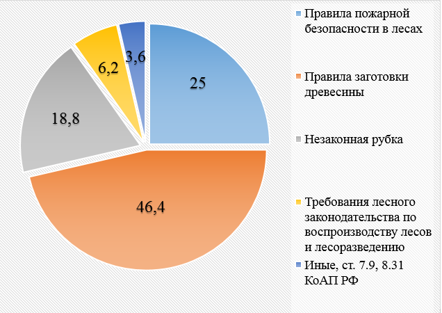 - нарушение требований лесного законодательства по воспроизводству лесов и лесоразведению (6,2 %). За прочие правонарушения лесного законодательства (нарушение Правил санитарной безопасности в лесах, самовольное занятие лесных участков) (3,6 %).