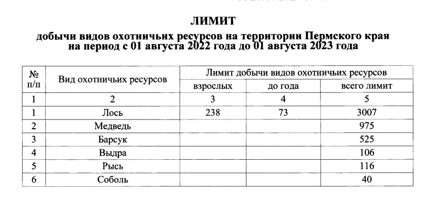Согласно информации пресс-службы Минприроды Пермского края, лимиты утверждены на год - с 1 августа 2022 года по 1 августа 2023 года.