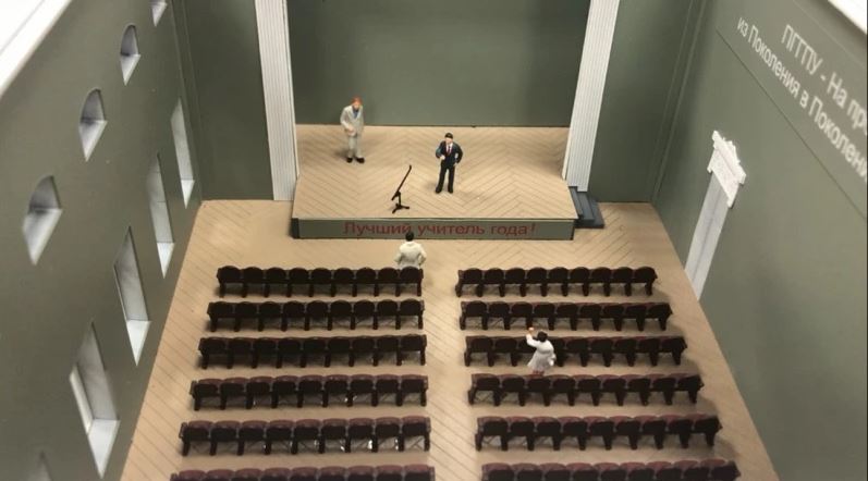 Внутри макета также можно увидеть актовый зал, который полностью идентичен настоящему. Там можно найти фигурки губернатора, преподавателей, ректора и студентов. Изображена церемония подведения итогов конкурса «Лучший учитель года»: Дмитрий Махонин лично объявляет победителя конкурса.