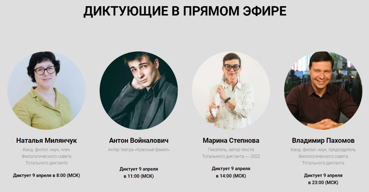 Так называемыми «диктаторами» на марафоне, со слов которых можно будет написать диктант, в этом году выступят:
