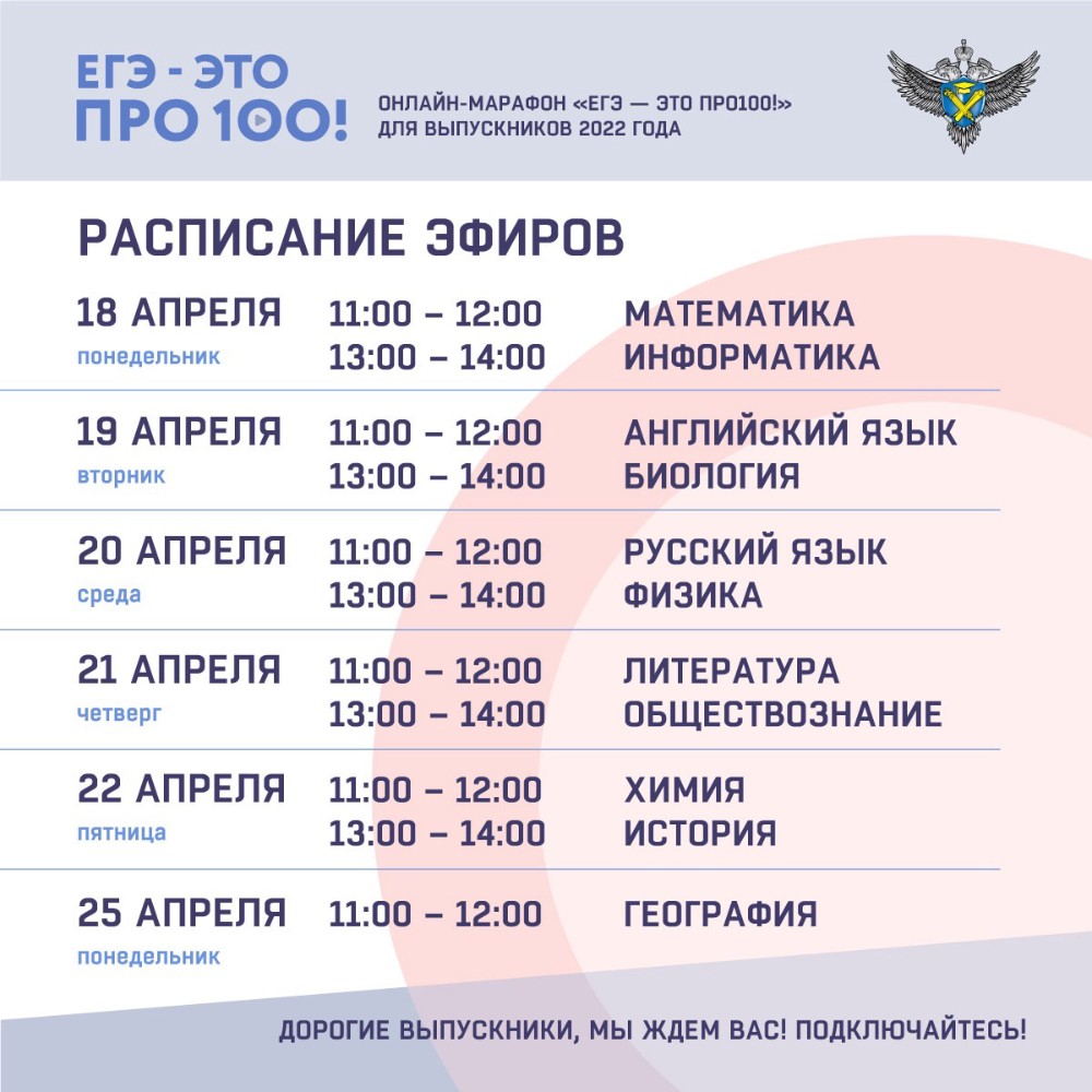 С 18 по 25 апреля стартует онлайн-марафон «ЕГЭ – это про100!». Его трансляцию можно будет посмотреть в официальных аккаунтах Рособрнадзора во ВКонтакте и на Rutube.
