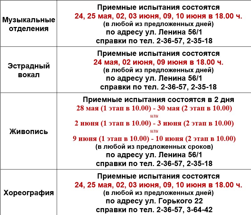 Записаться на вступительные испытания можно в любой день, кроме воскресенья, с 8:00 до 20:00 ч. по следующим адресам: ул. Ленина, 56/1 (музыкальное отделение, живопись), ул. Горького, 22 (хореография).