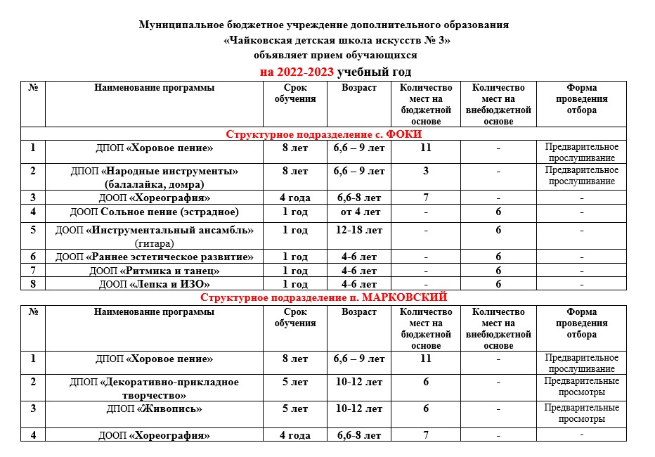 Свои двери открывает также Чайковская детская школа искусств №3 для жителей сёл Фоки и Б. Букор, а также посёлков Марковский и Прикамский. С доступными программами обучения, количеством доступных мест и прочими сведениями поступления можно ознакомиться на сайте школы: http://chaikmus.ru/uchenikam. Телефон для справок: 5-26-86.