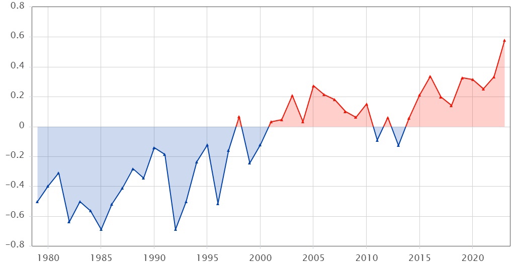 На графике приведены ежегодные значения средних отклонений за период апрель-октябрь с 1979 года