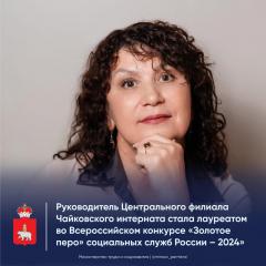 Ирина Макурова, руководитель Центрального филиала Чайковского дома-интерната для престарелых и инвалидов, стала лауреатом четвертого Всероссийского конкурса статей «Золотое перо» социальных служб России» от Пермского края.
