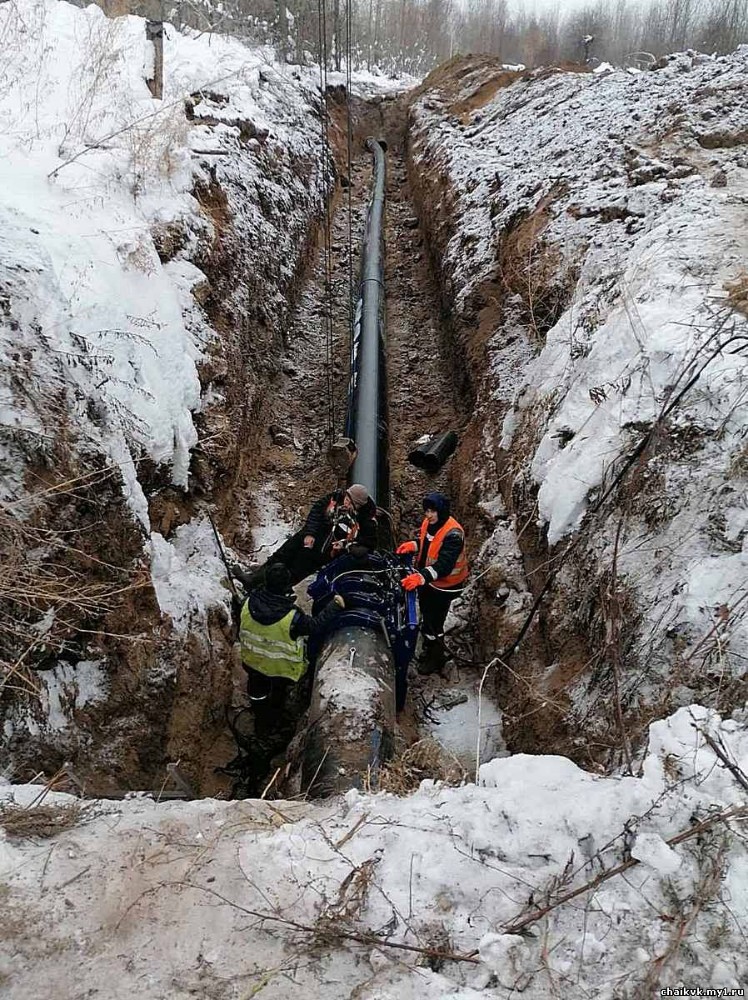 Накануне спаяли последнюю секцию нового водопровода, поместили в траншею (работы вели открытым способом с помощью экскаватора) и поставили этот участок магистрали под заполнение водой.
