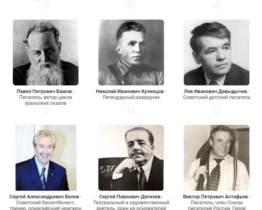 Карл Федорович Модерах (генерал-губернатор Пермской губернии), Дмитрий Емельянович Смышляев (Пермский городской голова), импресарио Сергей Павлович Дягилев, писатели Павел Петрович Бажов, Виктор Петрович Астафьев и Лев Иванович Давыдычев, олимпийский чемпион по баскетболу, тренер Сергей Александрович Белов, разведчик Николай Иванович Кузнецов, а также Род Строгановых – русских промышленников и государственных деятелей.