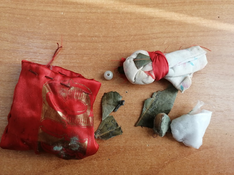 Во время ритуала аферистка сказала передать ей два обручальных кольца, которые женщина носила на руке. Золотые изделия вместе с деньгами гадалка завернула в полотенце и, прочитав молитву, закопала в землю. После этого вручила женщине оберег в виде красного матерчатого мешочка, наполненного лавровым листом, чесноком, гвоздикой и солью.