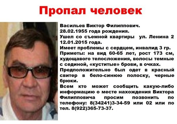Всем, кто можно сообщить какую-либо информацию о местонахождении Виктора Васильева просим сообщить об этом по т. 02 или же напрямую родственникам по т. 8-922-3657-337