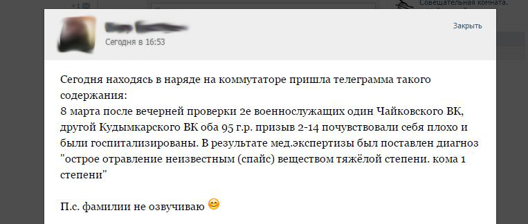 Со слов сослуживца солдат-срочников из Прикамья, в военной части, где произошел инцидент, был оглашен список молодых людей, употреблявших спайсы. В нем порядка пятнадцати человек.