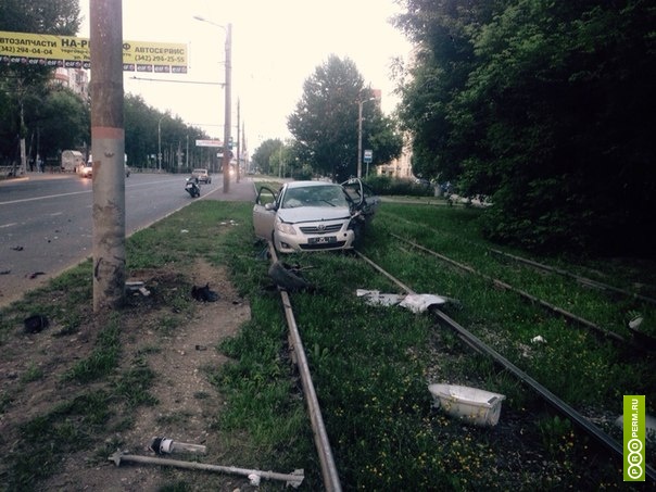 Вчера, 21 июня, в 1:52 в краевой столице 28-летний водитель Toyota Corolla двигаясь по бульвару Гагарина в направлении улицы Студенческая не справился с управлением и врезался в фонарный столб. От удара автомобиль вылетел на трамвайные пути.