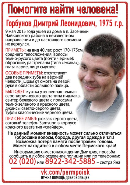 Напоминаем, что 9 мая 2015 года в 5.30 ч. Дмитрий Горбунов ушел из дома в п. Засечный Чайковского района в неизвестном направлении и до настоящего времени его местонахождение неизвестно. Родственники мужчины не раз организовывали поиски пропавшего, но они так и не увенчались успехом. В июле поступала информация о том, что похожего на Дмитрия мужчину видели в Перми.