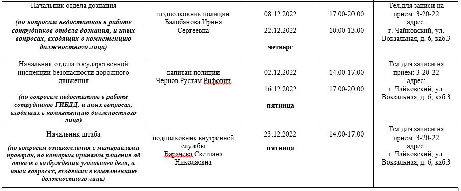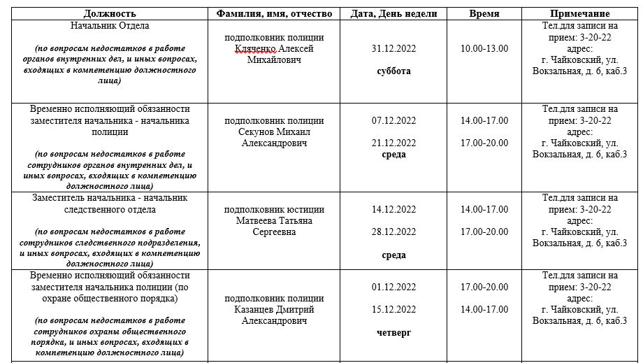 Руководящий состав Отдела МВД Росси по Чайковском городскому округу в декабре проведёт приём граждан и представителей организаций. Публикуем график приёма.