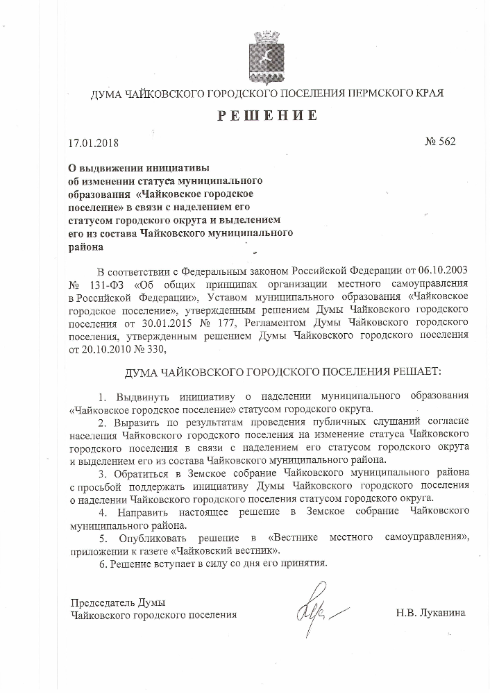 Накануне состоялось внеочередное заседание думы Чайковского городского поселения. Основным вопросом повестки стал вопрос о выдвижении инициативы об изменении статуса муниципального образования «Чайковское городское поселение» в связи с наделением его статусом городского округа и выделением из состава Чайковского муниципального района. Как сообщается на официальном сайте городской администрации, за выдвижение инициативы о наделении Чайковского городского поселения статусом городского округа проголосовали все 17 депутатов, присутствовавших на заседании.