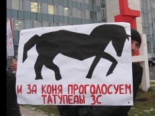 Не обошлось и без плакатов. Изобразив черного коня активисты вспомнили историю Древнего Рима, когда Калигула привел в Сенат своего коня, за которого сенаторы должны были голосовать, этим самым намекая на назначение Романа Панова.